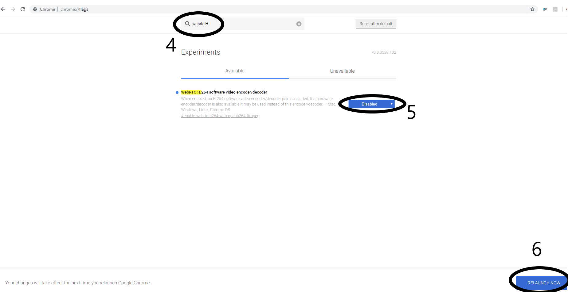 - Search for web rtc > Choose web rtc 264 software video encoder/decoder > DISABLE